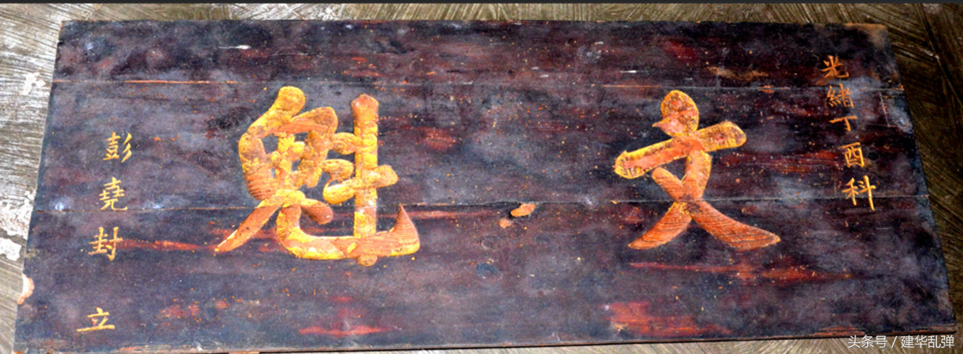 熱情的唐姓村民還保留了一塊寫有“文魁”寫匾額。老人說,原來堂屋里掛著一塊大匾和兩塊小匾,這是兩塊小匾中的一塊,大匾寫的什么不記得了,是誰拿走了也不知道,另一塊小匾也當(dāng)柴火燒掉了,現(xiàn)在看來是可惜了。小匾由三塊木板拼接而成,寬不足尺,長(zhǎng)不足米,蟲眼密布,有字的部分蟲眼少,看來這些小動(dòng)物對(duì)文化還是舍不得輕易破壞。匾中所書:光緒丁酉科 文魁 彭堯封 立”字,所有文字均以陰雕加漆金形式制作而成,均是筆劃圓潤(rùn),功力厚實(shí)的楷書體,“文魁”二字特別耀眼。聚資料顯示,文魁是古代科舉制度中對(duì)舉人的一種稱呼,清代鄉(xiāng)試考場(chǎng)設(shè)于各省稱貢院,于八月舉行,九月放榜,新科舉人第一名稱解元,第二名稱亞元,第三、四、五名稱經(jīng)魁,第六名稱亞魁,其余皆稱文魁。有人為激勵(lì)家人或后代,就立如此牌匾于家族之中,這匾上文魁是何人,立匾者又是何人?筆者至今未查閱核實(shí)到,敬請(qǐng)知悉者補(bǔ)正。