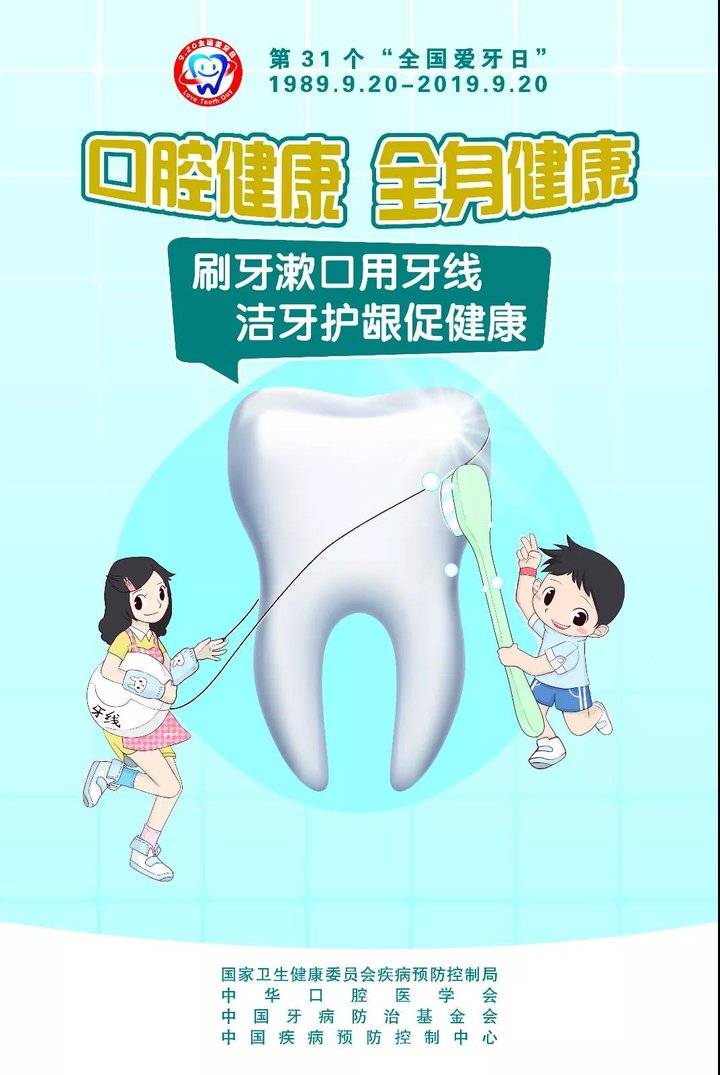 2019年9月20日是第31個(gè)“全國(guó)愛牙日”。今年的愛牙日主題是“口腔健康 全身健康”,副主題是“刷牙漱口用牙線 潔牙護(hù)齦促健康”,以口腔健康與全身健康的關(guān)系為切入點(diǎn),加大口腔健康科普宣傳力度,提高群眾口腔健康意識(shí),建立自我口腔健康行為,營(yíng)造有利于口腔健康的良好社會(huì)氛圍。