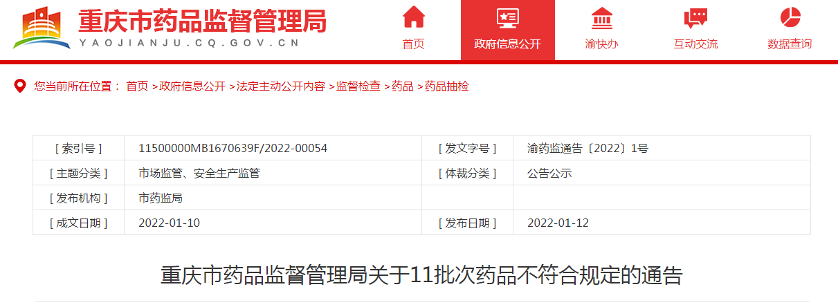 中國(guó)質(zhì)量新聞網(wǎng)訊 2022年1月12日,重慶市藥品監(jiān)督管理局網(wǎng)站發(fā)布關(guān)于11批次藥品不符合規(guī)定的通告。通告稱,為了加強(qiáng)藥品質(zhì)量監(jiān)督管理,規(guī)范市場(chǎng)秩序,保障公眾用藥,該局組織局屬檢查局、各區(qū)縣藥品監(jiān)管部門和檢驗(yàn)機(jī)構(gòu)開展藥品抽檢。經(jīng)重慶市食品藥品檢驗(yàn)檢測(cè)研究院等檢驗(yàn)機(jī)構(gòu)檢驗(yàn),標(biāo)示為廣西慧寶源醫(yī)藥科技有限公司等9家企業(yè)(醫(yī)院)生產(chǎn)(配制)的11批次藥品不符合規(guī)定。