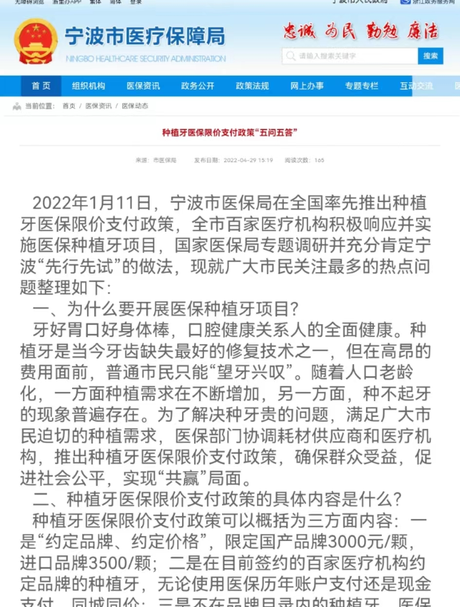 4月29日,寧波市醫(yī)療保障局發(fā)布消息稱,全國率先推出種植牙醫(yī)保限價支付政策,并組織百家醫(yī)療機(jī)構(gòu)開展集體簽約。
