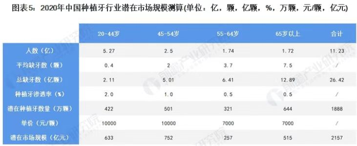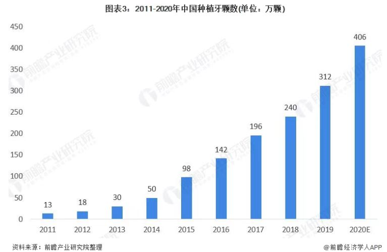 國內(nèi)的種植牙行業(yè)發(fā)展比較快,種植牙分為種植體和假體兩部分,種植體為底部的基座,需要進(jìn)入人骨,屬于三類器械,注冊管理嚴(yán)格。我國種植市場10年復(fù)合增長率達(dá)到48%,是增長快的種植牙市場之一,種植牙總量從2011年的13萬顆增長到2020年406萬顆。據(jù)測算,種植牙的潛在市場規(guī)模達(dá)約2000億左右。