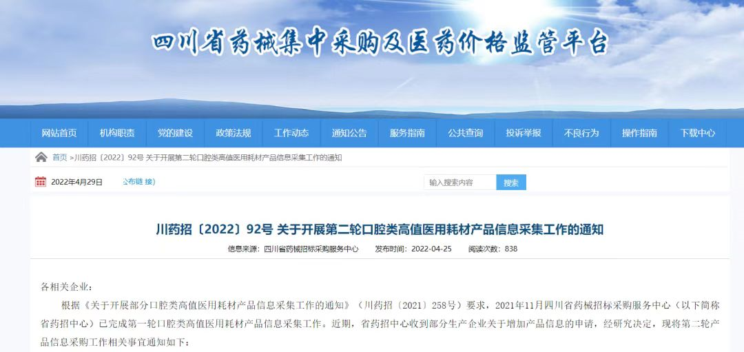 除了寧波,近日,四川省藥械集中采購及醫(yī)藥價格監(jiān)管平臺發(fā)布了《川藥招〔2022〕92號 關(guān)于開展第二輪口腔類高值醫(yī)用耗材產(chǎn)品信息采集工作的通知》(以下簡稱通知)。