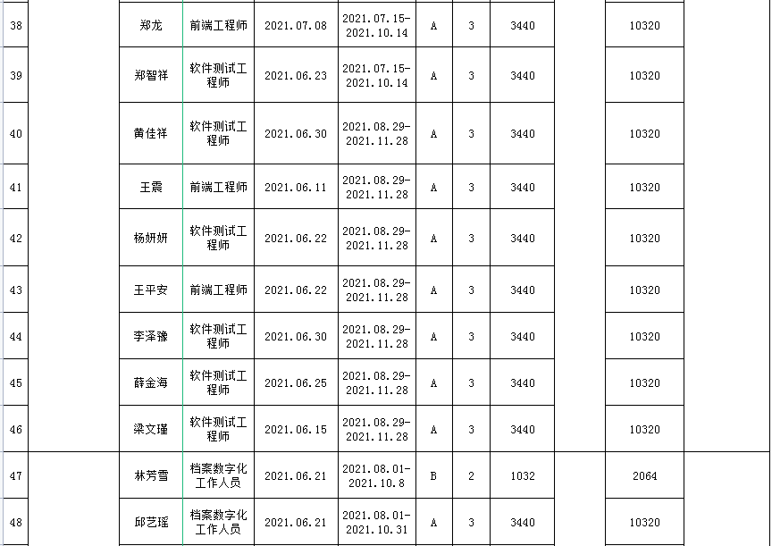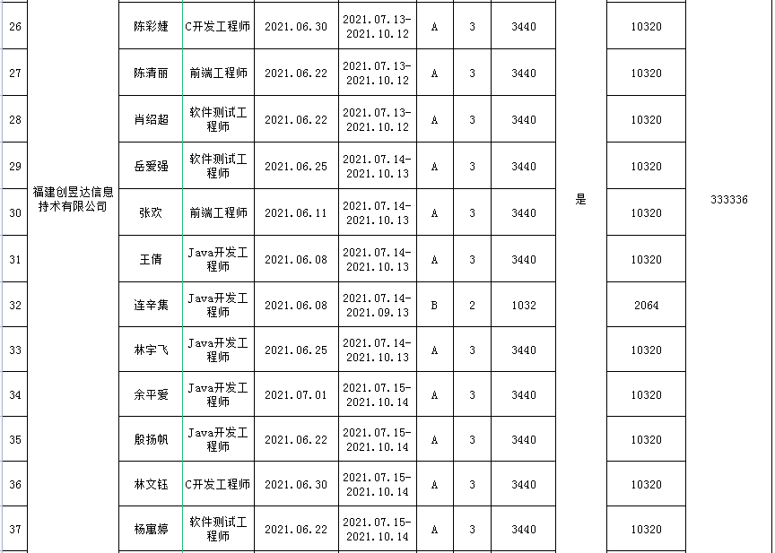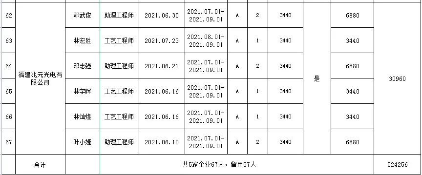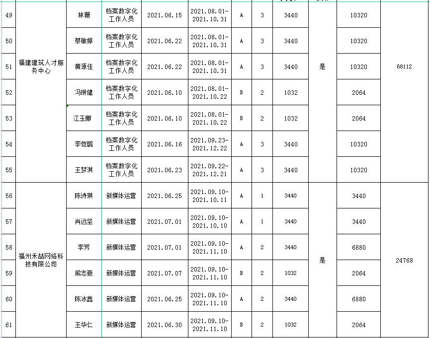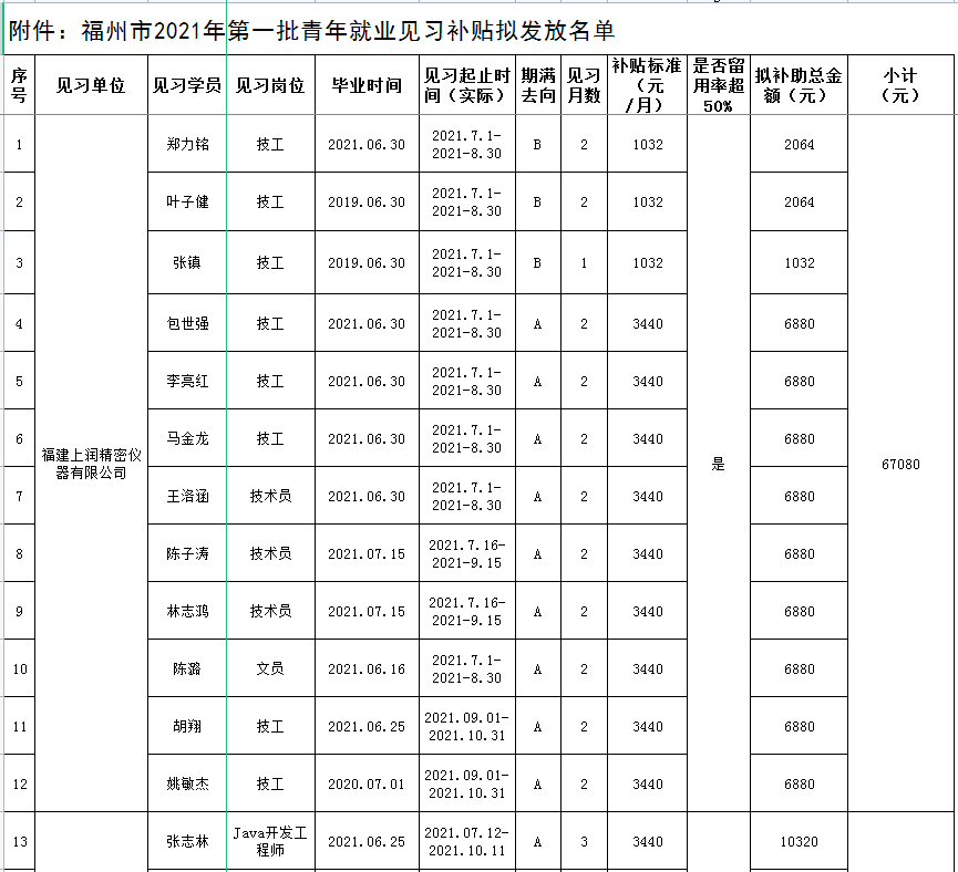 根據(jù)《關于印發(fā)的通知》(榕人社綜〔2019〕89號)的要求,2021年下半年福州人社局組織了一批見習單位開展就業(yè)見習活動,共有5家就業(yè)見習單位申領68名青年見習補貼。經材料審核及社保數(shù)據(jù)比對,中心擬對其中符合條件的67名見習人員發(fā)放見習補貼52.4256萬元(具體名單附后),現(xiàn)將福州市2021年第一批青年見習補貼擬發(fā)放名單予以公示,公示時間為2021年3月11日—2021年3月21日。在此期間,對發(fā)放補貼人員有異議的,請向福州人社局人事人才公共服務中心反映。