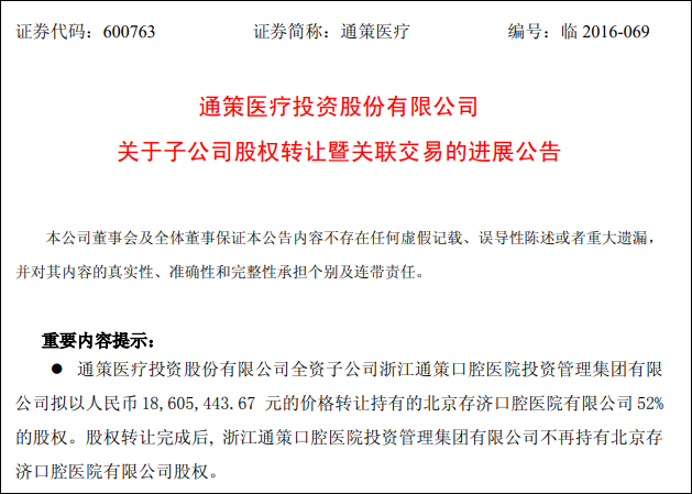 以北京地區(qū)為例:2007年12月,通策醫(yī)療以800萬元收購“北京通策京朝口腔醫(yī)院”(即后來的“北京存濟口腔醫(yī)院”),作為其布局省外的重要戰(zhàn)略舉措。2013年-2016年間,北京存濟分別虧損30萬元、29萬元、219萬元和211.67萬元。2016年10月,通策醫(yī)療發(fā)布公告,擬將該醫(yī)院52%股權(quán)出售給浙江通策口腔醫(yī)療投資基金。北京存濟口腔醫(yī)院遭到剝離。