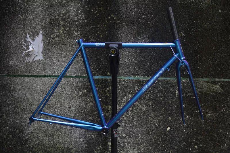 架子目前有4個(gè)尺寸,使用隱藏碗組,更纖細(xì)的后上叉,前三角下管加粗。讓整個(gè)鋼架在不降低剛性和強(qiáng)度的情況下重量大幅度減輕。全碳前叉,隱藏式軸承碗組,使用漂亮的藍(lán)紫色 變色龍烤漆,通過不同的角度觀看,車架可以呈現(xiàn)深淺不一的藍(lán)紫色變色龍的果。
