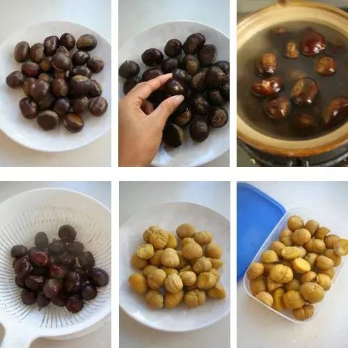 【熱水浸泡法】:生栗子洗凈后放入器皿中,加鹽少許,用滾沸的開水浸沒,蓋鍋蓋。5分鐘后,取出栗子切開,內(nèi)皮即隨栗子殼一起脫落。