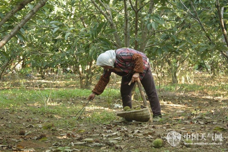 栗農(nóng)在撿板栗(攝影:梁麗莉)