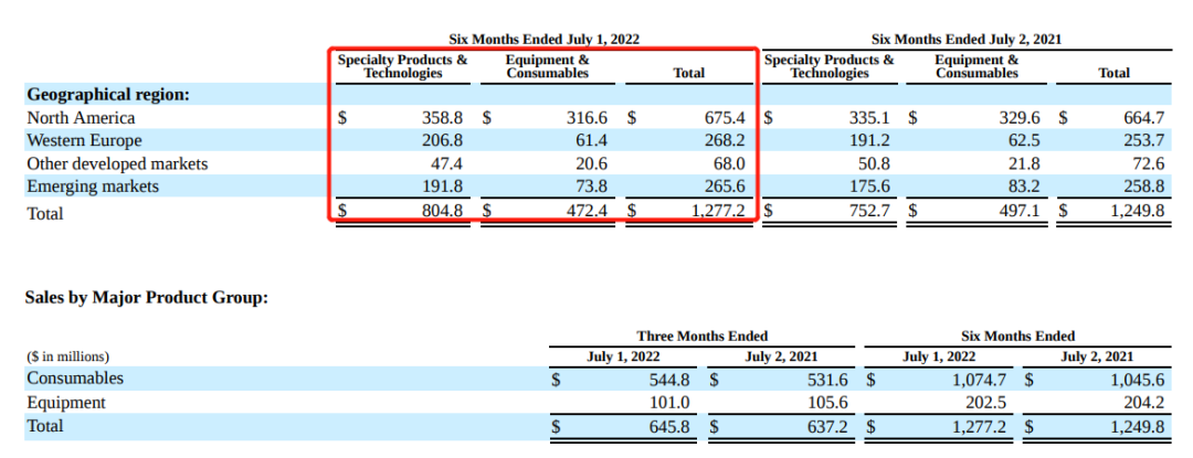 北美:仍是大的市場(chǎng),營(yíng)收6.75億美元(+2%),占比53%;比2021年底(54%)少了一個(gè)百分點(diǎn)。在專業(yè)產(chǎn)品與技術(shù)業(yè)務(wù)領(lǐng)域,北美占比45%;而在牙科設(shè)備與耗材業(yè)務(wù)領(lǐng)域,北美占比高達(dá)67%。