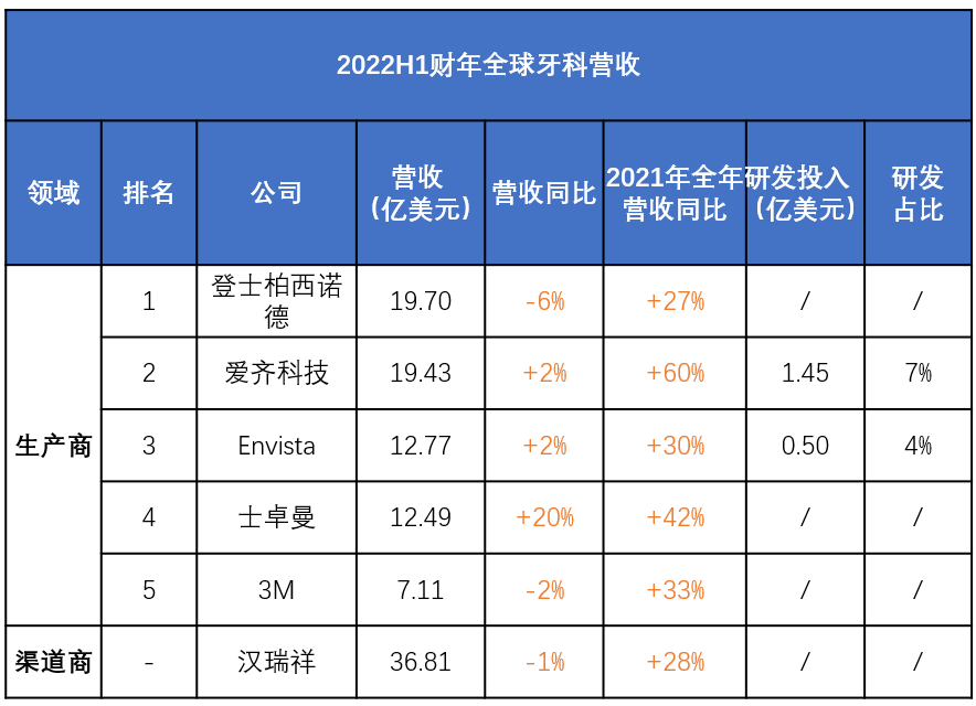 愛齊科技:與登士柏西諾德差距不到0.3億美元,保持營(yíng)收正增長(zhǎng)(+2%)2022上半年,愛齊科技營(yíng)收19.43億美元,+2%。而在2021全年,其營(yíng)收增速為+60%。