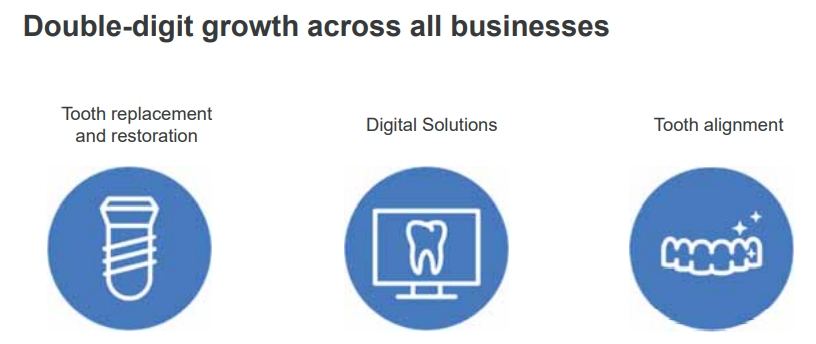 士卓曼的營(yíng)收增速高達(dá)+20%,在所有企業(yè)中一騎絕塵。種植、數(shù)字化解決方案、正畸三大業(yè)務(wù)均呈雙位數(shù)增長(zhǎng)。
