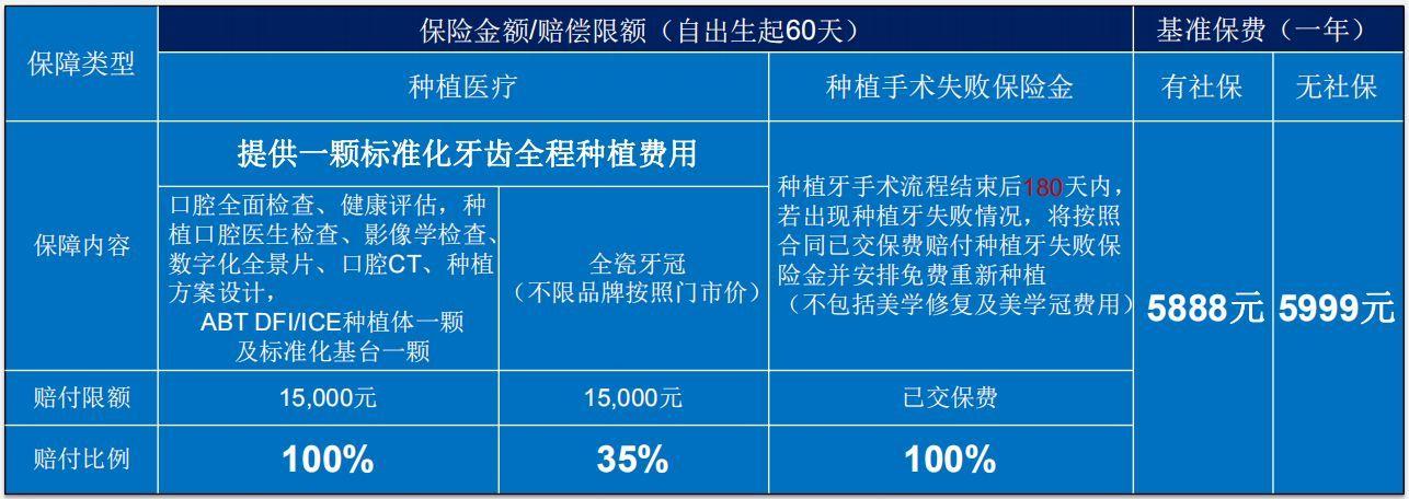 種植牙手術(shù)流程結(jié)束后180天內(nèi),若出現(xiàn)種植牙失敗情況,將按照合同已交保費賠付種植牙失敗保險金并免費重新種植。