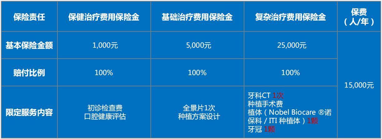 提供一顆標準化牙齒全程種植費用;保額15000元;賠付;