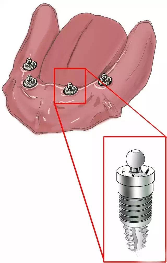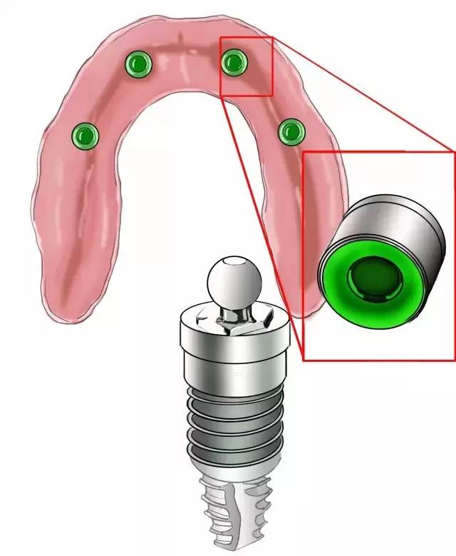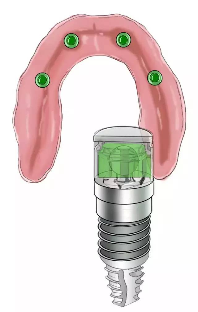 修復(fù)基臺(tái)連接上 球帽固位裝置——準(zhǔn)確的說(shuō)是“球”,“帽”在總義齒的組織面上。