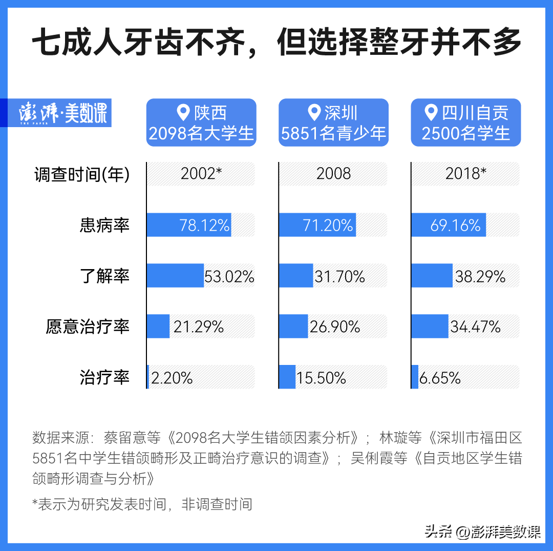 2000 年,中華口腔醫(yī)學(xué)會(huì)就曾在全國范圍內(nèi)對 2 萬余名兒童和青少年進(jìn)行錯(cuò)頜畸形的調(diào)查,結(jié)果顯示,67.82% 的被調(diào)查對象有不同程度的錯(cuò)頜畸形。隨后在全國不同地區(qū)、不同時(shí)間進(jìn)行的調(diào)查或多或少佐證了上述結(jié)果,且都呈現(xiàn)出這樣的趨勢:患病率高,了解率和調(diào)節(jié)率卻不高。