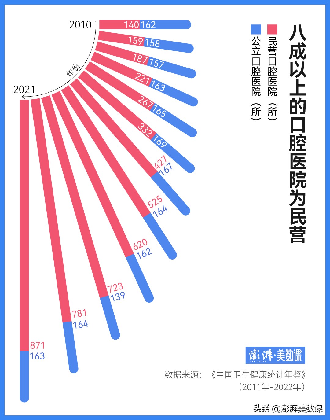 這就不得不提正畸所在的這個(gè)領(lǐng)域:口腔科是民營化、市場化高的醫(yī)療行業(yè),且大部分服務(wù)都沒有納入醫(yī)保。根據(jù)《中國衛(wèi)生健康統(tǒng)計(jì)年鑒》,中國八成以上的口腔醫(yī)院為民營,這還不包括星羅棋布的私人口腔診所。