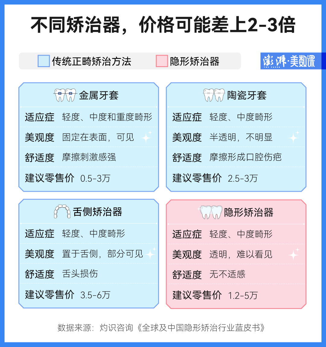 相比于傳統(tǒng)的金屬牙套,隱形正畸因?yàn)闆]有傳統(tǒng)矯治過程中的鋼絲和托槽,透明不影響牙齒美觀而逐漸受到大家青睞,但售價(jià)也高出不少。相比一些國產(chǎn)金屬牙套幾千元的價(jià)格,有的進(jìn)口隱形矯治器售價(jià)能超過 5 萬元。