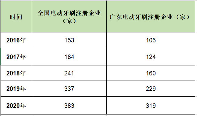 自2016年掀起的電動牙刷熱仍在持續(xù)。據(jù)中用電器協(xié)會的數(shù)據(jù),2017年和2018年,國內(nèi)電動牙刷銷售額分別達到32億元和48億元,同比增長70%和50%。由此引發(fā)了巨頭入局、資本熱捧。天眼查數(shù)據(jù)顯示,2016年全國電動牙刷新增注冊企業(yè)153家,2020年這一數(shù)字已經(jīng)達到383家,其中廣東企業(yè)占比超過8成。