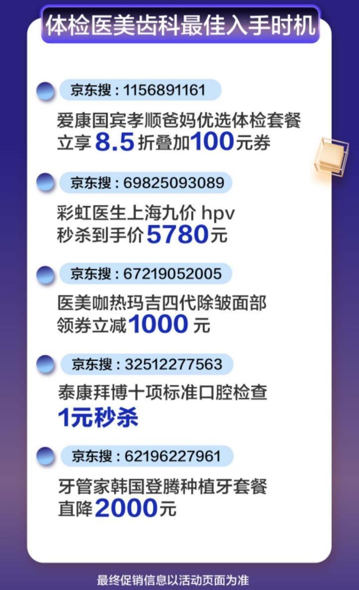 此外,京東健康還推出彩虹醫(yī)生上海九價(jià)hpv疫苗到手價(jià)僅5780元,泰康拜博口腔檢查1元,牙管家種植牙套餐直降2000元等活動(dòng)鉅惠。