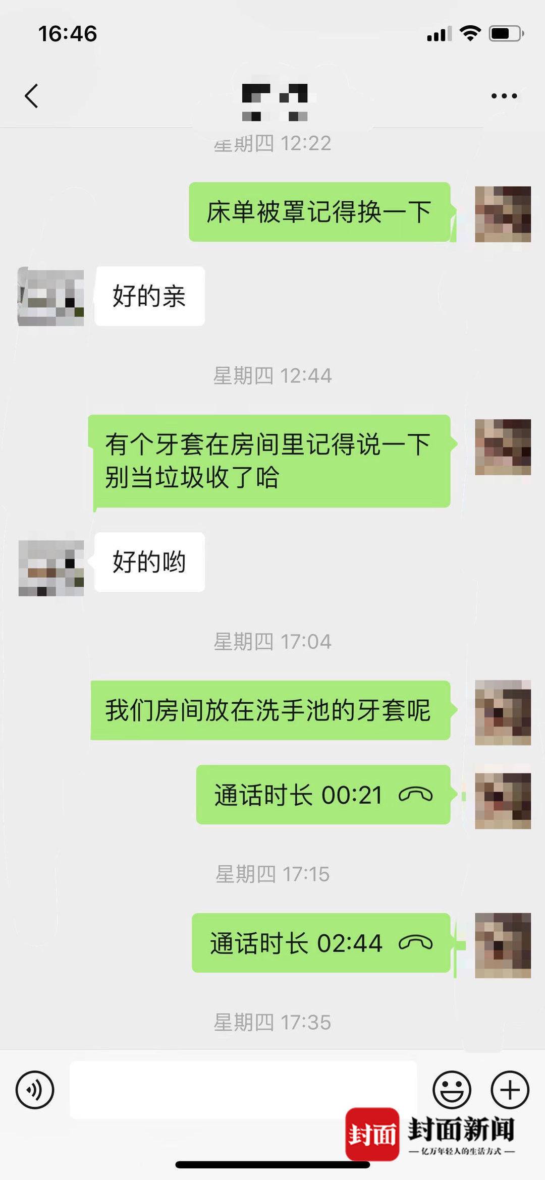 9月4日下午,封面新聞記者在酒店見到了前臺員工和清潔員。據(jù)前臺員工介紹,當(dāng)天她的確收到了客人發(fā)送的注意牙套的消息,也向清潔員轉(zhuǎn)達(dá)了該信息。