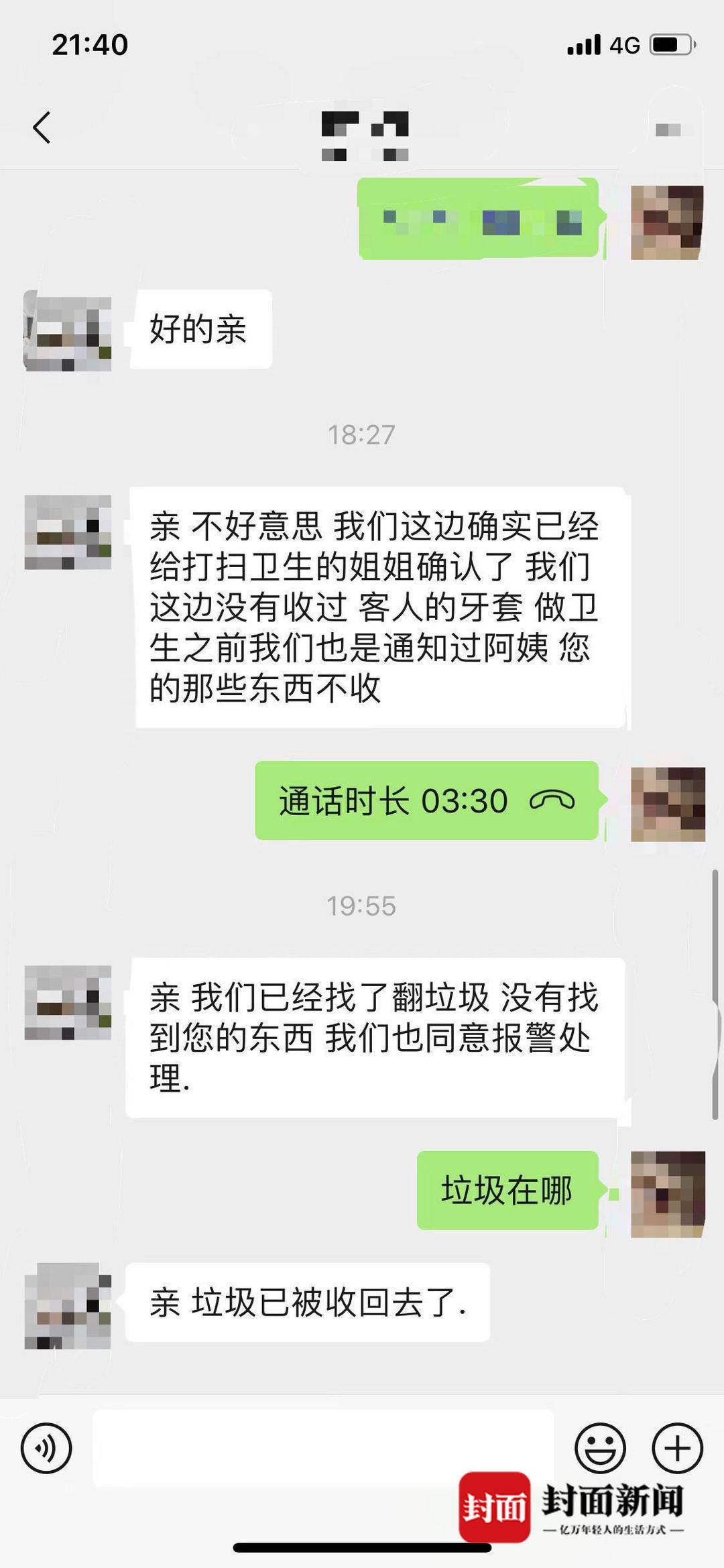 下午5點(diǎn),張婷與家人回到酒店房間后,發(fā)現(xiàn)牙套不見了。“當(dāng)即我就給前臺發(fā)消息詢問,前臺說幫我們找一下。隨后又說物業(yè)把垃圾運(yùn)走了,找不到了,并稱清潔員在打掃過程中并沒有見到牙套?!?/p>
