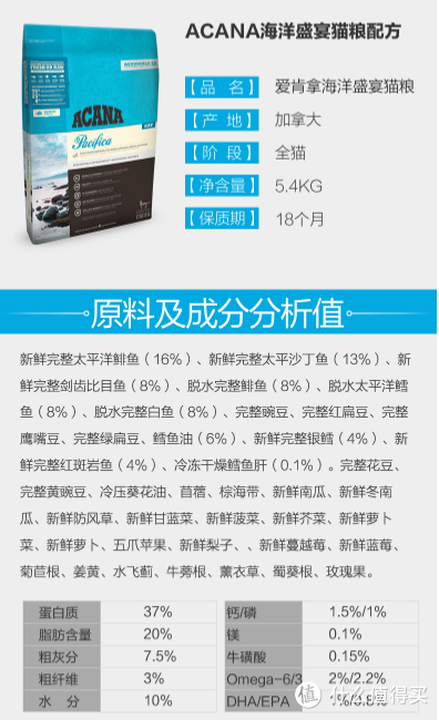 【愛肯拿ACANA海洋盛宴】愛肯拿海洋盛宴,低價買過855元兩袋。海洋盛宴的魚肉含量是75%,粗蛋白37%,比渴望稍低一點,和渴望一樣是0谷物。買愛肯拿的原因是醫(yī)生說新一君目前10斤算正常,但是還是要控制好體重,渴望蛋白質(zhì)含量太高了,建議換低一點的。