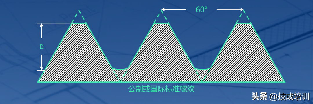 公制螺紋代號M,適用于直徑0.25mm至300毫米的工件連接,螺紋角度60°,牙頂為平面,易于車削,牙底為圓弧形,可以增加螺紋強度。公制螺紋有粗牙和細牙之分。