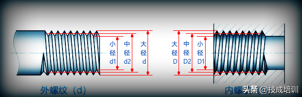 外螺紋和內(nèi)螺紋分別用大小寫字母“d”和“D”來表示螺紋直徑。比如外螺紋的大、中和小徑就用d、d1和d2表示;內(nèi)螺紋則用D、D1、D2表示。