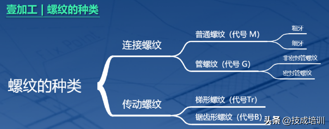 三角螺紋以代號M的普通螺紋和代號G的管螺紋為主。M螺紋是常用的連接螺紋,分為粗牙和細牙,細牙主要用在細小或薄壁零件上。管螺紋用于水管、氣管等管路的連接。
