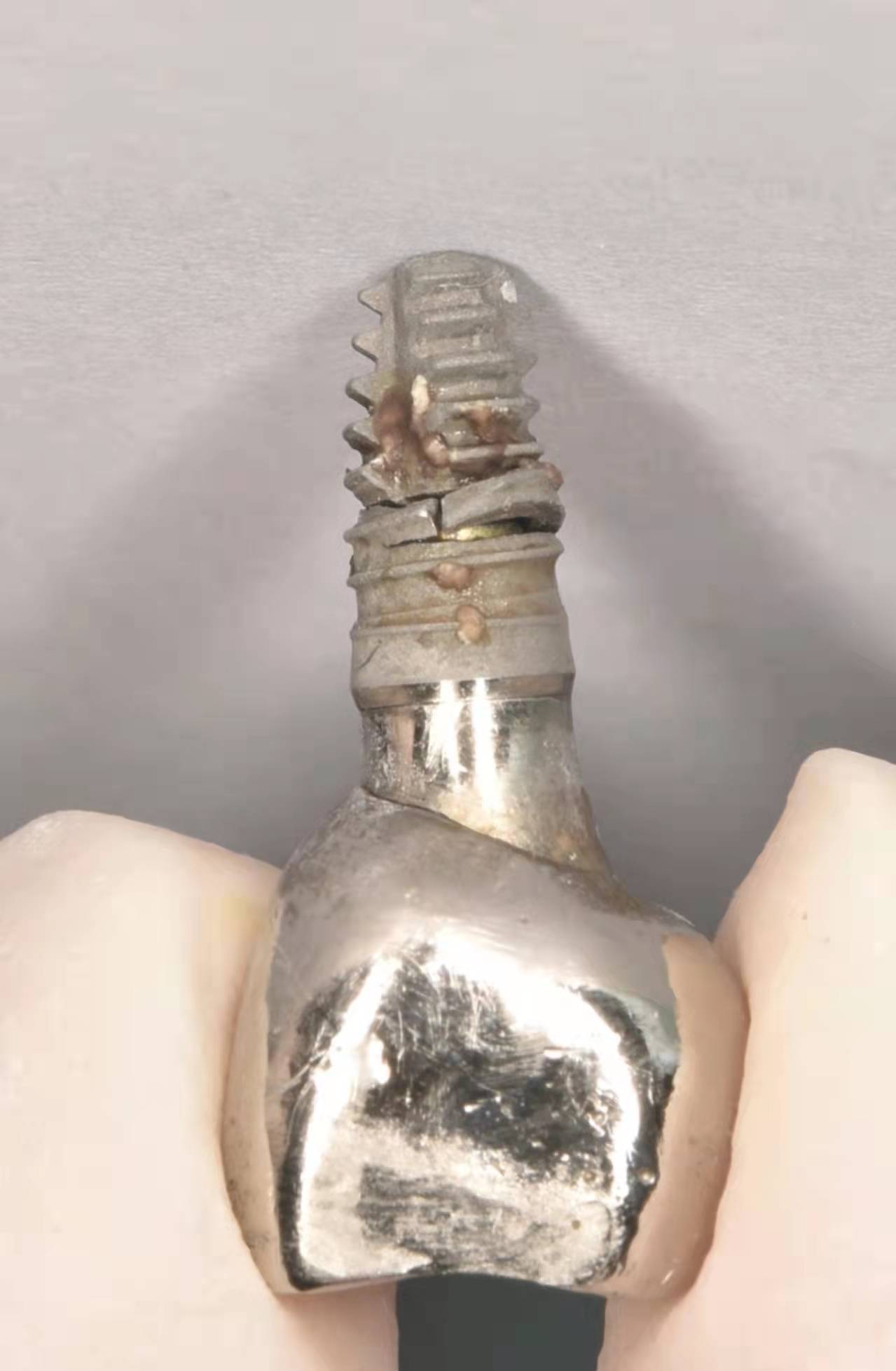 這是我在醫(yī)生交流網(wǎng)上找的一張圖,很,種植體已經(jīng)壞掉了,被取出來(lái)了。