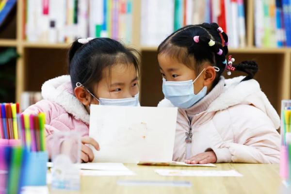 在泗洪縣瑤溝鄉(xiāng)官塘社區(qū)新時(shí)代文明實(shí)踐站,參加愛(ài)心托管班的小朋友交流繪制的年畫。許昌亮攝(新華社)