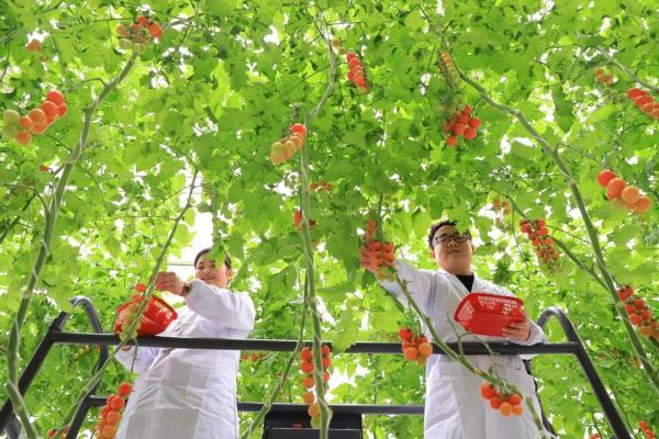 東安縣華維節(jié)水公司智慧農(nóng)業(yè)大棚內(nèi),員工們采摘圣女果準(zhǔn)備上市。嚴(yán)潔攝(新華社)