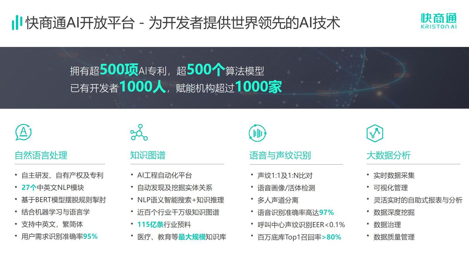 快商通作為批布局人工智能的企業(yè),始終奮斗在科技創(chuàng)新一線,深刻體會(huì)到科技競(jìng)爭(zhēng)愈加激烈,科技自立自強(qiáng)對(duì)于和民族具有重要意義。在布局AI的13年中,快商通重視底層算法自研,匯集了一支由斯坦福大學(xué)、劍橋大學(xué)、新加坡國立大學(xué)、清華大學(xué)等國內(nèi)外學(xué)府成員組成的科研團(tuán)隊(duì),通過自然語言處理(NLP)、知識(shí)圖譜(KG)、語音識(shí)別(ASR)、聲紋識(shí)別(VPR)四大核心技術(shù)創(chuàng)新實(shí)現(xiàn)卓越績,擁有超500項(xiàng)AI專利,發(fā)布超600篇論文,與廈門大學(xué)、華僑大學(xué)等院校開展緊密的產(chǎn)學(xué)研合作,以“產(chǎn)學(xué)研一體化”為依托,持續(xù)保持的技術(shù)創(chuàng)新水平,增強(qiáng)快商通在人工智能領(lǐng)域的話語權(quán)與主導(dǎo)權(quán)。