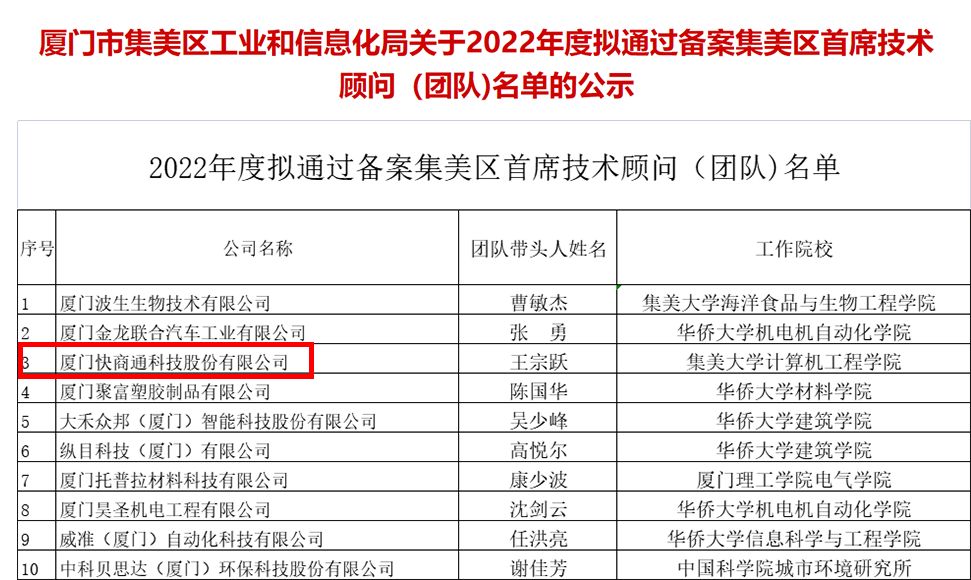 近日,廈門市集美區(qū)工業(yè)和信息化局關(guān)于2022年度擬通過備案集美區(qū)技術(shù)顧問(團(tuán)隊(duì))名單全網(wǎng)公示。經(jīng)過征求“集美區(qū)高校產(chǎn)業(yè)技術(shù)聯(lián)盟”意見,并對(duì)企業(yè)的相關(guān)資質(zhì)、研發(fā)投入及經(jīng)濟(jì)貢獻(xiàn)等方面進(jìn)行綜合考量,快商通技術(shù)團(tuán)隊(duì)成功入選“廈門市集美區(qū)技術(shù)顧問(團(tuán)隊(duì))”!