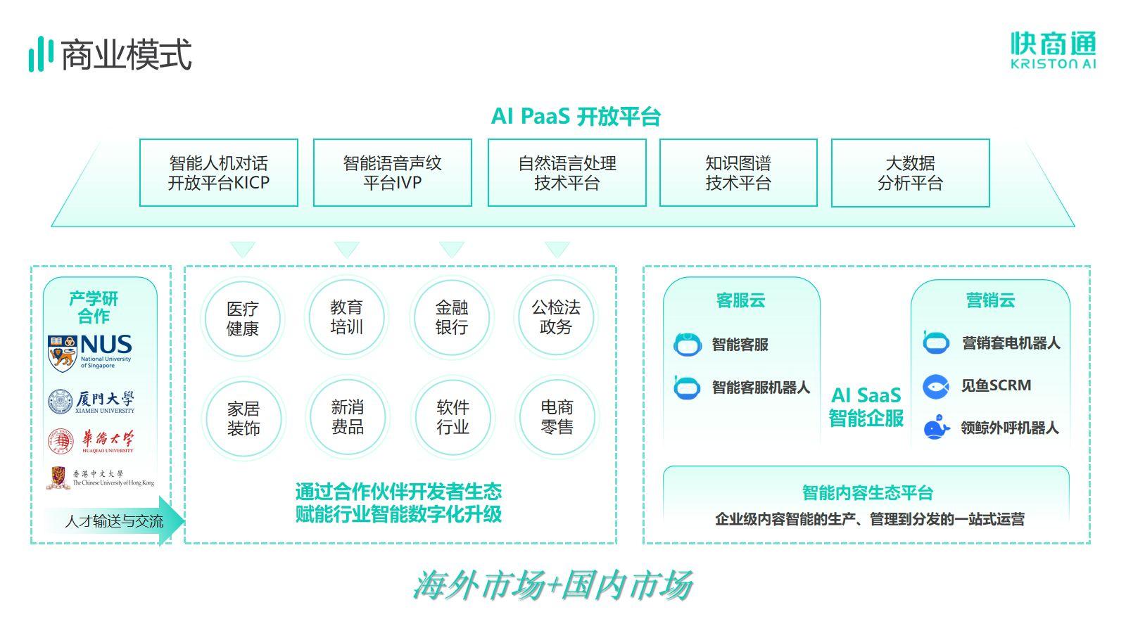 基于自主研發(fā)核心能力,快商通搭建AI PaaS開放平臺(tái),以AI PaaS平臺(tái)為依托開發(fā)了AI SaaS 智能企服產(chǎn)品體系,同時(shí)扶持有需求、有想法、有創(chuàng)新的開發(fā)者們對(duì)技術(shù)進(jìn)行調(diào)用,推動(dòng)人工智能與產(chǎn)業(yè)深度融合發(fā)展。AI SaaS 智能企服產(chǎn)品體系,主要賦能于醫(yī)療醫(yī)美、教育、家居等企業(yè)機(jī)構(gòu),基于對(duì)話式AI能力,提供流量、AI+SaaS工具、運(yùn)營服務(wù)三位一體的全鏈路解決方案,幫助企業(yè)實(shí)現(xiàn)全域流量的營銷、流量資源的整合拓展、提升品牌營銷率、助力私域高變現(xiàn)、拓寬企業(yè)的增長邊界。目前快商通AI SaaS全鏈路營銷解決方案已經(jīng)擁有邦泰集團(tuán)、登特口腔、雍禾植發(fā)、歐派家居、新華教育等重要合作伙伴,積累了38萬+客戶資源,在數(shù)字技術(shù)及應(yīng)用方面具有深厚的技術(shù)積累和行業(yè)沉淀。