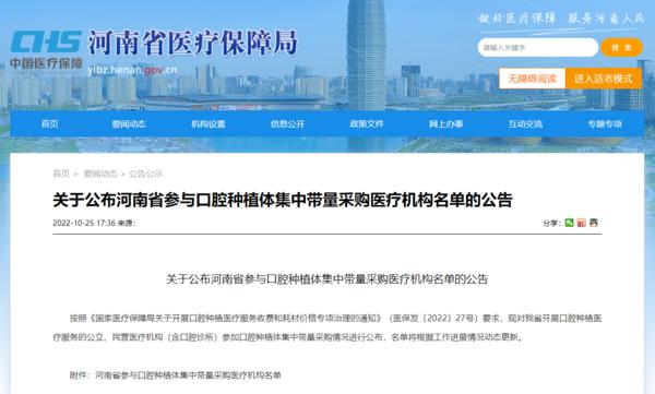 大河網(wǎng)訊 10月28日,記者從河南省醫(yī)療保障局獲悉,河南省參與口腔種植體集中帶量采購(gòu)醫(yī)療機(jī)構(gòu)名單公布,涵蓋390家醫(yī)療機(jī)構(gòu),其中既有公立醫(yī)院,也有民營(yíng)醫(yī)療機(jī)構(gòu)。
