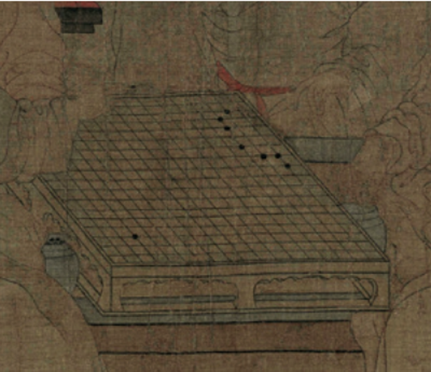 再看看觀棋和弈棋的座次,這正好是李家王朝繼位的順序:李璟→景遂→景達(dá)→景逿。這不會是偶然的巧合,而是中主李璟精心設(shè)計的結(jié)果,是繪畫構(gòu)思的一部分。畫中棋盤的布子進(jìn)一步說明了這個排序的人為因素和恒定性。