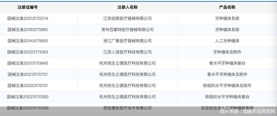 民生立德醫(yī)療是擁有骨水平牙種植體基臺、骨水平牙種植體及附件、軟組織水平牙種植體及附件等四款產(chǎn)品的國內(nèi)廠商。根據(jù)藥監(jiān)局官網(wǎng)信息,包括民生立德醫(yī)療在內(nèi),牙種植體,牙種植體系統(tǒng)獲得三類醫(yī)療器械證的國內(nèi)廠商共有16家。