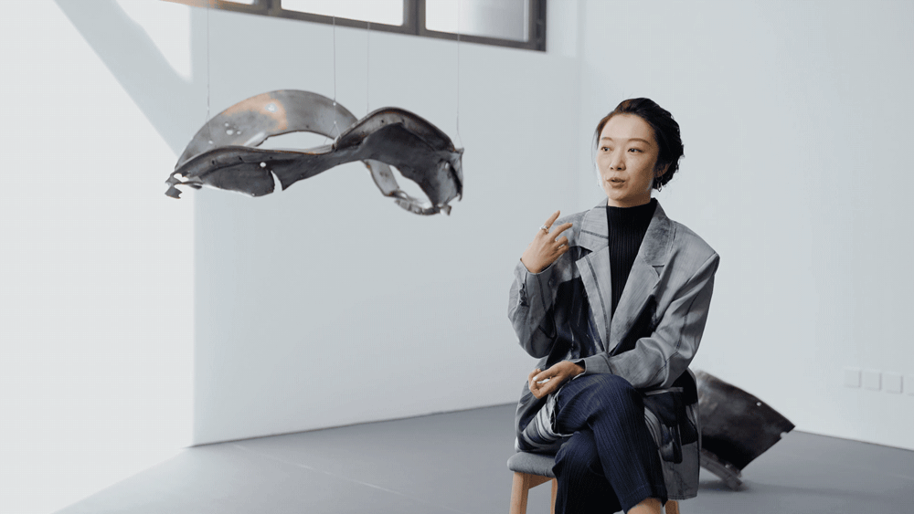 在個展現(xiàn)場接受一條的采訪,背后是她在貴州、甘肅、青海沿路找到的火箭殘骸