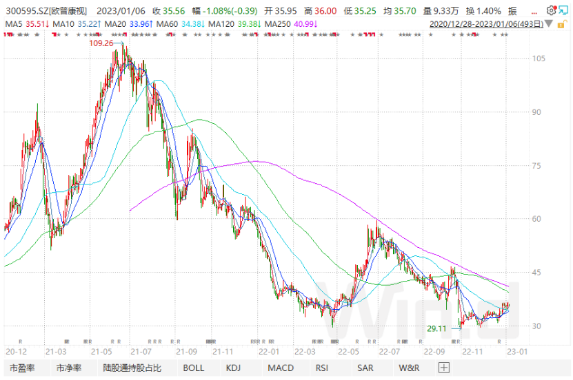 2017年初,A股“眼科茅”歐普康視(證券代碼:300596.SZ)登陸創(chuàng)業(yè)板,在國產(chǎn)OK鏡龍頭、高達(dá)90%的毛利率的加持下,歐普康視股價從2.3元一路狂奔至109.26元,高市值達(dá)到880億元。