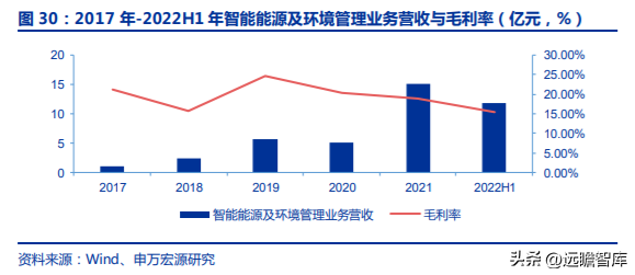綠能業(yè)務(wù)屬于項(xiàng)目制,訂單和收入的不確定性和波動(dòng)性較大,2021 年在下游頭部客戶投資建廠需求的拉動(dòng)之下,實(shí)現(xiàn)營(yíng)業(yè)收入 15.11 億元,同比增長(zhǎng) 196%;2021 年該業(yè)務(wù)毛利率 18.91%。