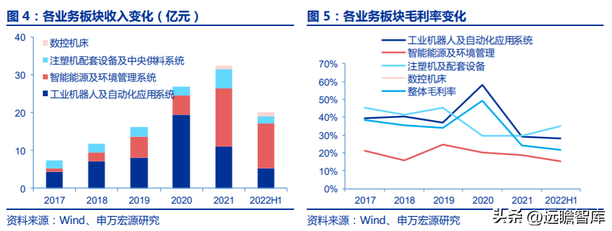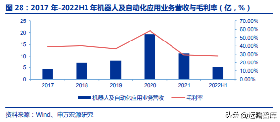 2021 年工業(yè)機(jī)器人&集成業(yè)務(wù)實(shí)現(xiàn)營(yíng)業(yè)收入 11.17 億元,占總收入比重為 34%。毛利率 29%。2020 年該業(yè)務(wù)的收入和毛利率有一定脈沖式增長(zhǎng),主要由于口罩機(jī)及相關(guān)設(shè)備銷(xiāo)售貢獻(xiàn)約 13 億元收入,且毛利率高達(dá) 69.4%,該業(yè)務(wù) 2021 年及以后基本終止。