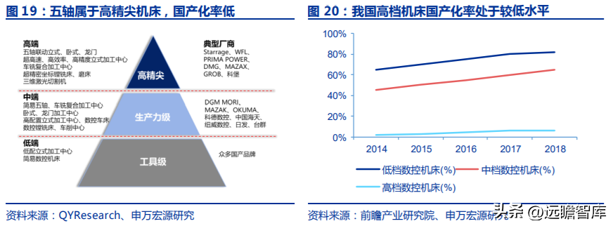 根據(jù)前瞻研究院數(shù)據(jù),2018 年我國(guó)低檔數(shù)控機(jī)床國(guó)產(chǎn)化率約 82%,中檔數(shù)控機(jī)床國(guó)產(chǎn)化率約 65%,數(shù)控機(jī)床國(guó)產(chǎn)化率僅約 6%。