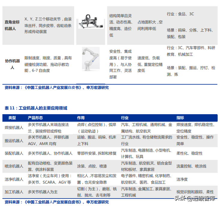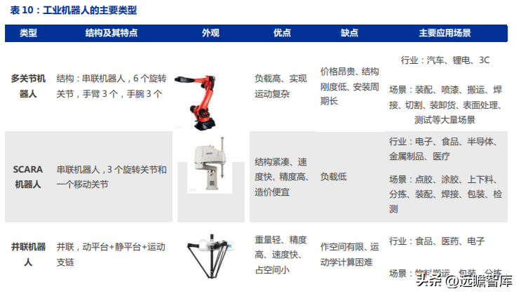 按照結(jié)構(gòu)來(lái)分,工業(yè)機(jī)器人主要包括多關(guān)節(jié)機(jī)器人、SCARA 機(jī)器人、并聯(lián)機(jī)器人、直角坐標(biāo)機(jī)器人、協(xié)作機(jī)器人;按應(yīng)場(chǎng)景分,包括焊接、噴涂、搬運(yùn)、潔凈、裝配機(jī)器人。
