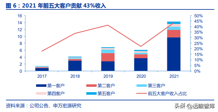 2021 年前五 大客戶分別貢獻(xiàn)收入 9.7 億元、2.2 億元、8650 萬(wàn)元、7801 萬(wàn)元和 7009 萬(wàn)元,合計(jì)占收 入比重 43.23%。各賽道具有結(jié)構(gòu)性機(jī)遇和長(zhǎng)期發(fā)展空間,持續(xù)貢獻(xiàn)增量。