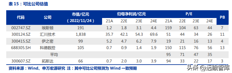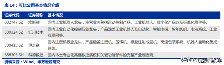 選取注塑機(jī)行業(yè)、工業(yè)機(jī)器人行業(yè)和機(jī)床行業(yè)的企業(yè)作為可比公司。由于公司業(yè)務(wù)包括智能能源和環(huán)境管理、工業(yè)機(jī)器人、注塑機(jī)、數(shù)控機(jī)床四大板塊,均屬于智能制造裝備,各業(yè)務(wù)有較強(qiáng)的的市場(chǎng)協(xié)同和技術(shù)協(xié)同性。我們選擇埃斯頓、匯川技術(shù)、伊之密、科德數(shù)控作為可比公司。其中,