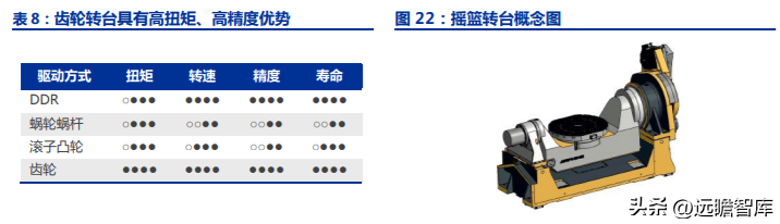 2)轉(zhuǎn)臺(tái)是三軸向五軸轉(zhuǎn)型的關(guān)鍵,直接影響加工剛性、穩(wěn)定性和回轉(zhuǎn)精度。