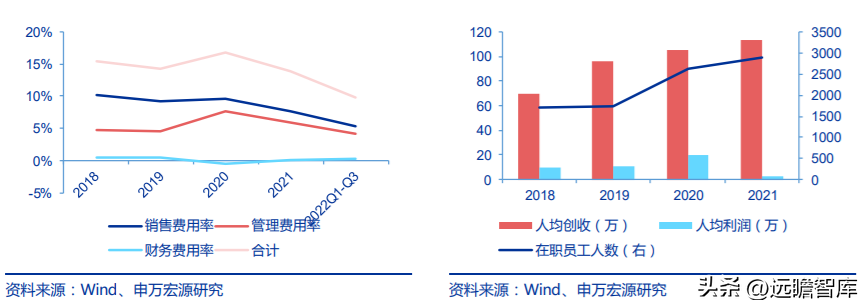 2022Q1-Q3 管理費(fèi)用、銷(xiāo)售費(fèi)用和財(cái)務(wù)費(fèi)用合計(jì)占比為 9.79%,較去年同期下降 4.08pct。 重視人才引進(jìn),人均創(chuàng)收持續(xù)提升。