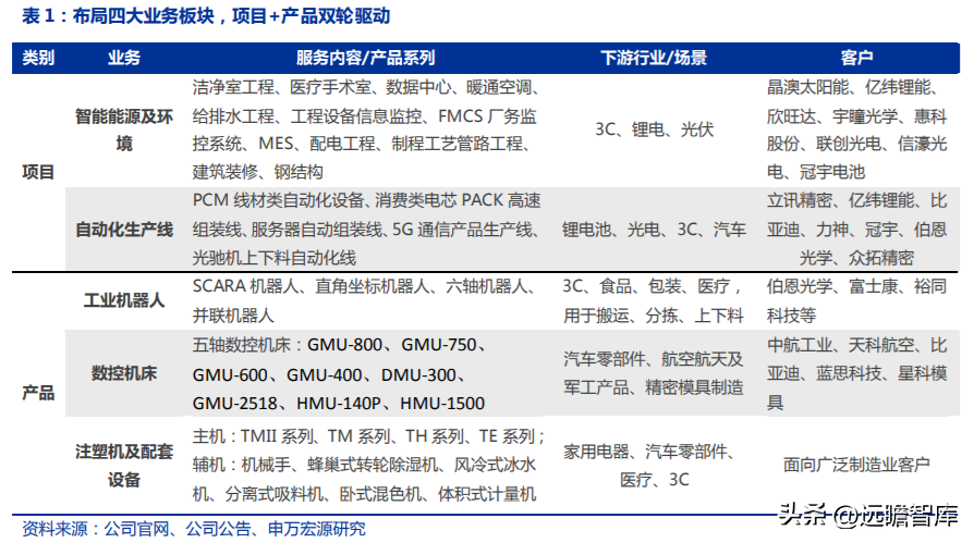 ① 智能能源及環(huán)境管理業(yè)務(wù):公司擁有經(jīng)驗(yàn)豐富的設(shè)計(jì)團(tuán)隊(duì)與多項(xiàng)工程建設(shè)安裝資質(zhì),服務(wù) 3C、鋰電、光伏等行業(yè)的廠房建設(shè);②自動(dòng)化應(yīng)用系統(tǒng)業(yè)務(wù):為新能源、3C、光電、汽車(chē)零部件等行業(yè)頭部客戶提供自動(dòng)化系統(tǒng)解決方案。