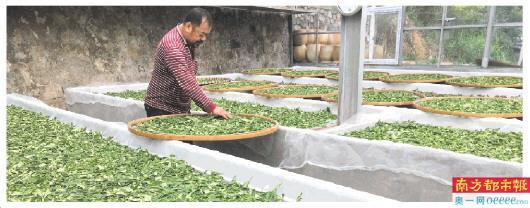 大雨初歇,滿山青翠。茶場主人朋伯帶領南都記者參觀茶場里的茶廠。雖然條件簡單,但茶廠的設備一應俱全。朋伯說,茶場與廣東科貿(mào)職業(yè)學院長期合作,學校每年安排茶藝專業(yè)學生來此實習。此時在茶廠正有一名女生林月春,主要負責茶葉揉捻、干燥工序。走水、萎凋、揉捻、悶黃、發(fā)酵、干燥,制作白云紅茶、黃茶的工序有很大區(qū)別,使用機器也不盡相同。紅茶干燥三次,每一次的溫度不同。林月春和朋伯將茶葉在竹篾團上攤薄,再放入機器中進行干燥處理。溫度是110攝氏度。