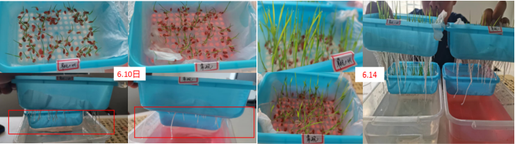 天然蕓苔素碩豐481?+拌種劑對(duì)水稻進(jìn)行拌種,提前促進(jìn)萌芽,苗粗苗壯。2022年6月2日在江蘇東臺(tái)采用16ml碩豐481?+拌種劑500ml稀釋至1000ml對(duì)40kg水稻進(jìn)行拌種,當(dāng)天進(jìn)行萌芽試驗(yàn),3天后開始萌芽,7天果。與單用拌種劑相比,使用16ml碩豐481+拌種劑500ml處理水稻種子與單用拌種處理的水稻種子萌芽早2天,同時(shí)出苗率高30%,根系多40%,而單純使用拌種處理的水稻種子出苗晚、葉片發(fā)黃、存在發(fā)白卷曲現(xiàn)象,同時(shí)根系發(fā)育慢、生長差,參差不齊。